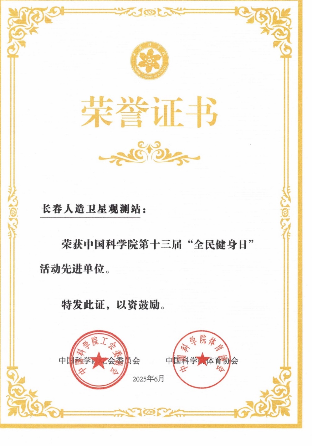 中国科学院体育协会公布了中国科学院第十三届“全民健身日”活动先进单位名单,凭借在全民健身工作中的扎实举措与突出成效,长春人造卫星观测站荣获“先进单位”称号。这是中国科学院体育协会对我单位职工体育工作的高度认可,更是对全站科研人员积极健康精神风貌的充分肯定。 一直以来,长春人造卫星观测站始终坚持以职工需求为导向,深入贯彻落实全民健身国家战略及中国科学院体协关于职工体育工作的统一部署,将全民健身与科研事业发展深度融合,精心策划并组织开展了一系列形式多样、内容丰富的体育活动。在赛事组织方面,成功举办趣味运动会,羽毛球、乒乓球等比赛项目,赛场上展现出顽强拼搏、团结协作的精神风貌,让健身融入日常工作生活,有效缓解科研压力。 在积极开展自主活动的同时,积极组织职工参与中国科学院“百日健步行”“气排球比赛”等重点活动,均取得优异成绩。其中,在中国科学院百日健步行活动中,职工参与率达100%,持续保持全院前列。 此次荣获先进单位称号,既是荣誉更是鞭策。下一步,将以此为契机,持续深化全民健身工作内涵,让体育活动更贴合科研人员需求,激励全体职工以更饱满的热情、更强健的体魄投身科研事业,为实现高水平科技自立自强贡献力量。