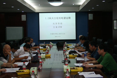 2012年8月15日,根据《长春人造卫星观测站1米级大视场空间碎片光电望远镜采购项目》三方协议书(编号:CCRWZ2012-003,2012年5月28日)的相关要求,中国科学院国家天文台在中国科学院上海天文台天文大厦三楼会议室组织召开了长春人卫站1.2米望远镜项目光学设计评审会。与会专家和领导:国家天文台副台长郝晋新、原副台长王宜、王森研究员和葛亮,上海天文台朱能鸿院士、副处长董晓军、王兰娟研究员、周丹、陈振东、杨美婷和张晔,紫金山天文台吴连大研究员,南京中科天文仪器有限公司董事长王永、胡企千研究员、陈馨恺研究员、胡明勇研究员,福建福光数码科技有限公司总经理肖维军,国家天文台长春人卫站站长刘承志和李振伟。郝晋新副台长担任此次评审委员会主任,并主持了会议。